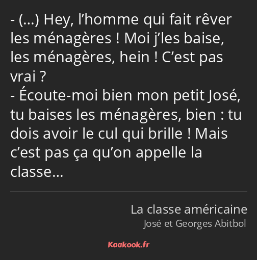 Citations de José et Georges Abitbol dans La classe américaine filmsérie Citation de Constantin Costa-Gavras. La Classe américaine ou Le Grand Détournement est un téléfilm de 1993 écrit et réalisé par Michel Hazanavicius et Dominique Mézerette. Qui regarde à lintérieur séveille.